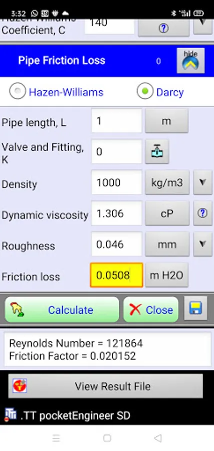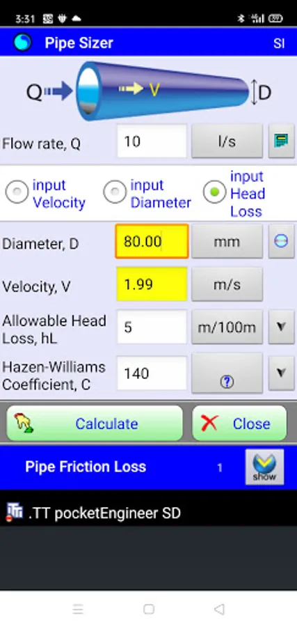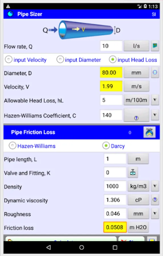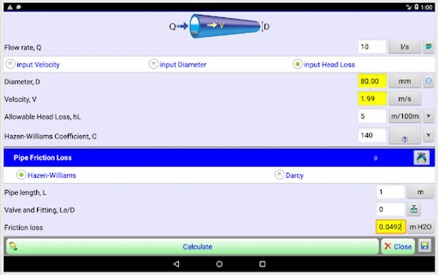 - Pipe Sizer:- pipe sizing (by Velocity or Allowable Head Loss or Diameter methods) for general water applications; extendable to pipe frictional loss calculation with Hazen-Williams equation and Le method for valve and fittings, or Darcy-Weisbach equation and K method for valve and fittings. Select pipe DN/ID sizes from a list of pipe material table.