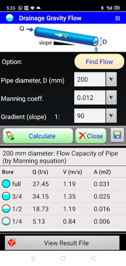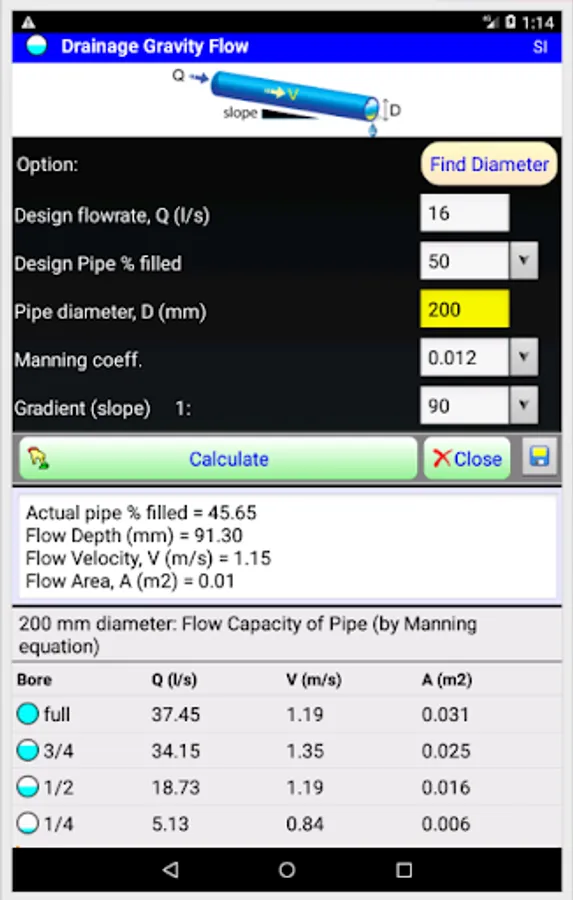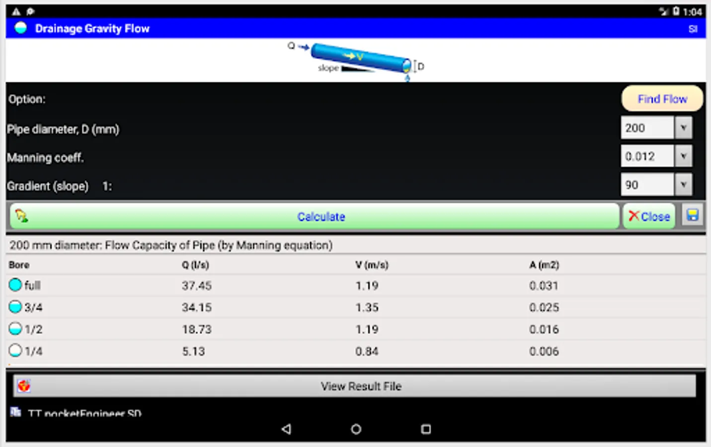 - Drainage gravity flow:- find flowrate or pipe diameter for full bore, 3/4 bore, 1/2 bore and 1/4 bore solved by the most popular Manning equation.