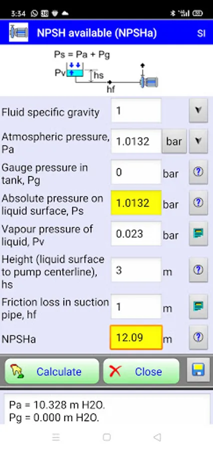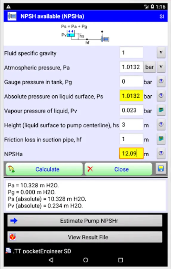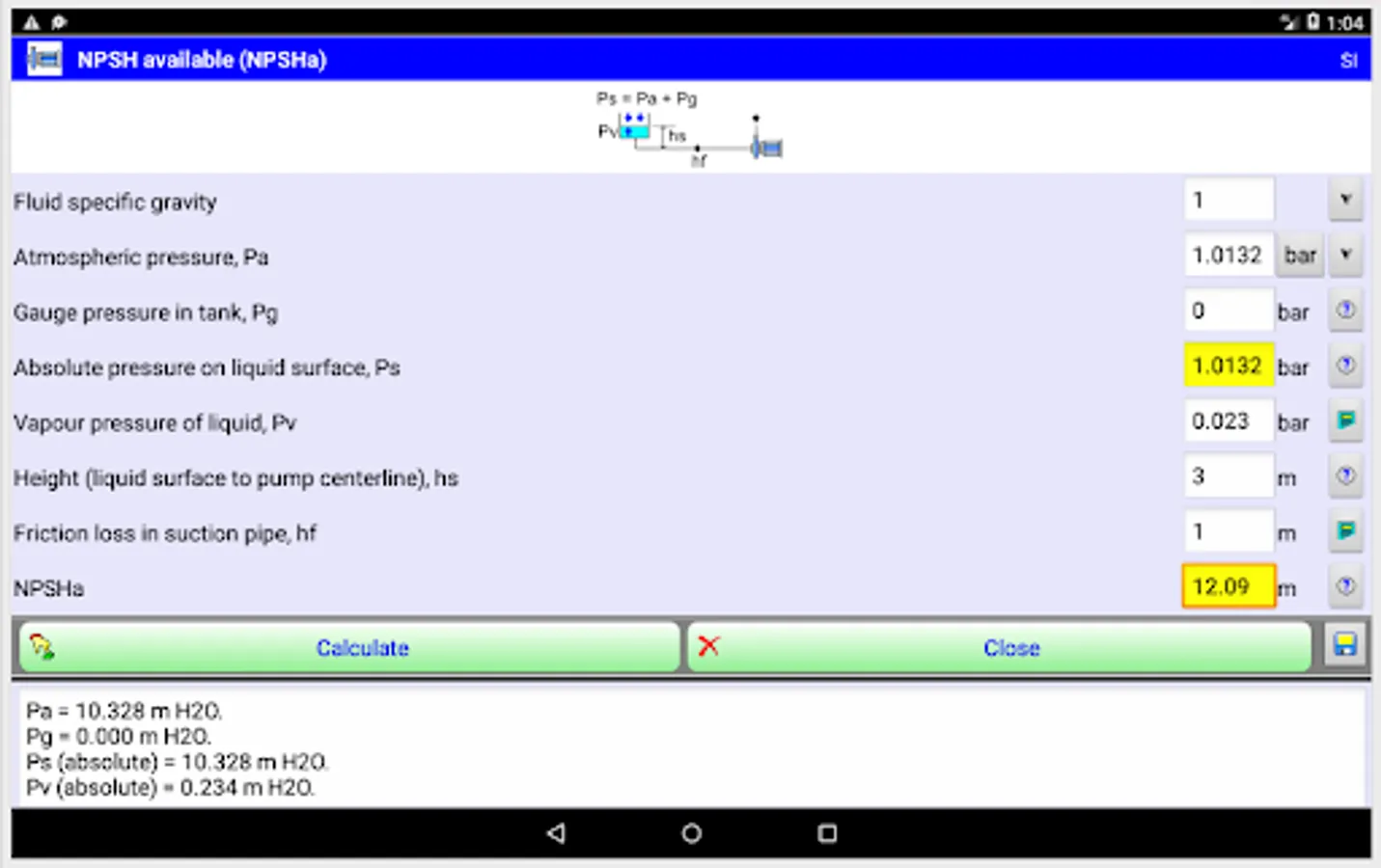 - Pump NPSH:- calculate NPSHa (available) and NPSHr (required) with various built-in selections including liquid vapour pressure and pipe friction losses.