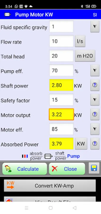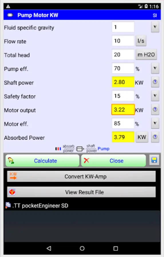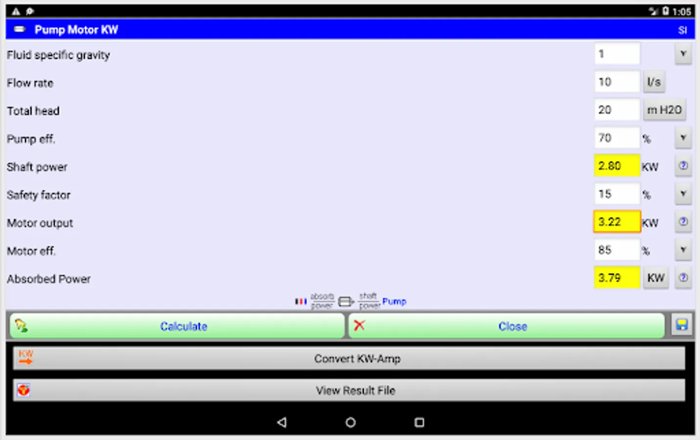 - Pump motor kW:- calculate absorbed power for pump with built-in selection for IE1 to IE4 motor efficiency tables.