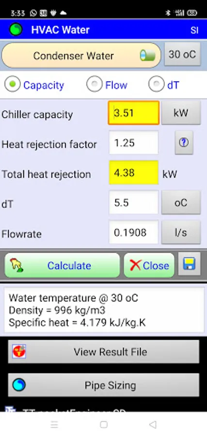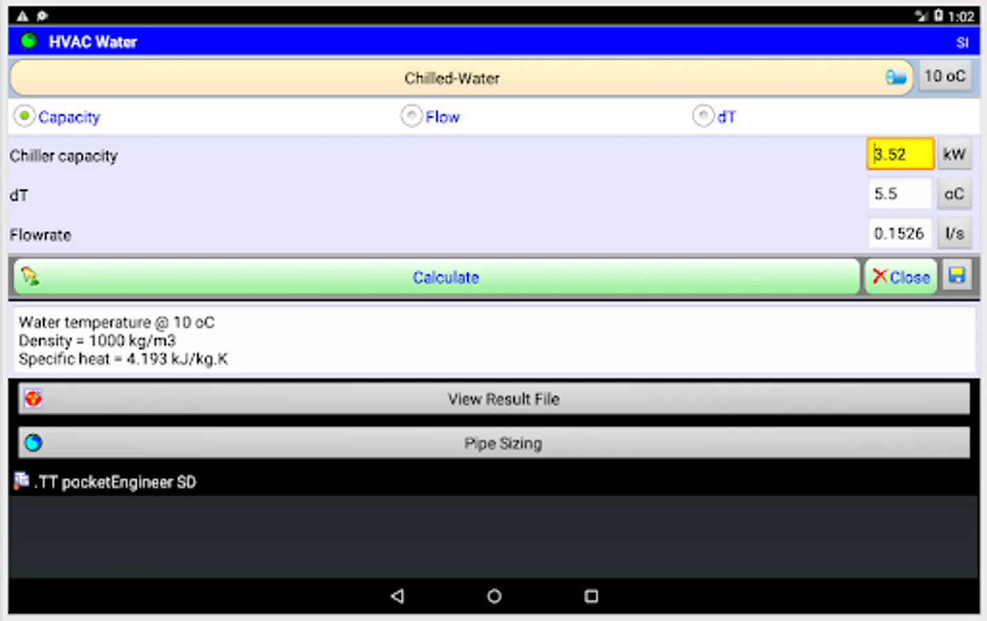 A quick design solution for pipe sizing + pipe friction losses (with valve and fittings losses), chilled-water flowrate, condenser water flowrate, hot water flowrate, drainage gravity flow, drainage pipe gradient, pump motor KW, Pump NPSHa and NPSHr, Water density and viscosity, etc.
