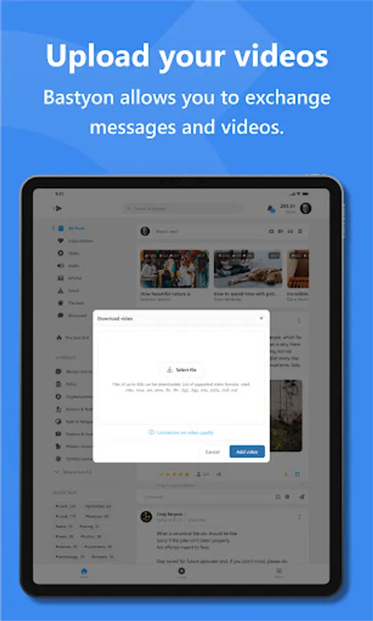Bastyon lets you share your posts and videos, Upload them safely, import them from YouTube (contact us so that we can help!), make sure to let them visible to everyone. Forever. No one will be able to remove or ban them.