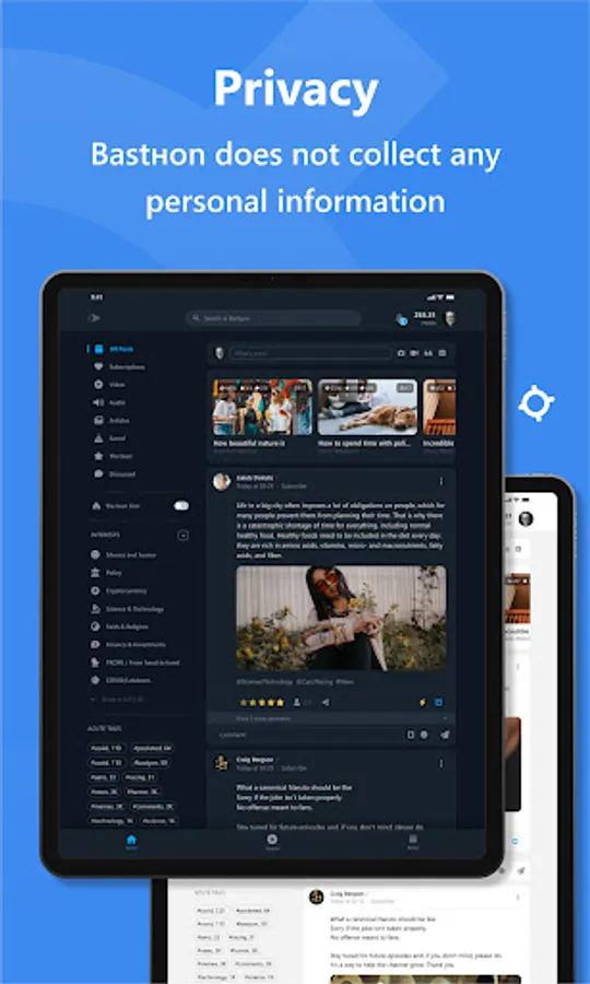 Bastyon fights to remove censorship from the digital world. Too many times we see accounts being blocked or limited, contents removed by the platform or the governments. On Bastyon, not even admins can remove your posts or close your account.