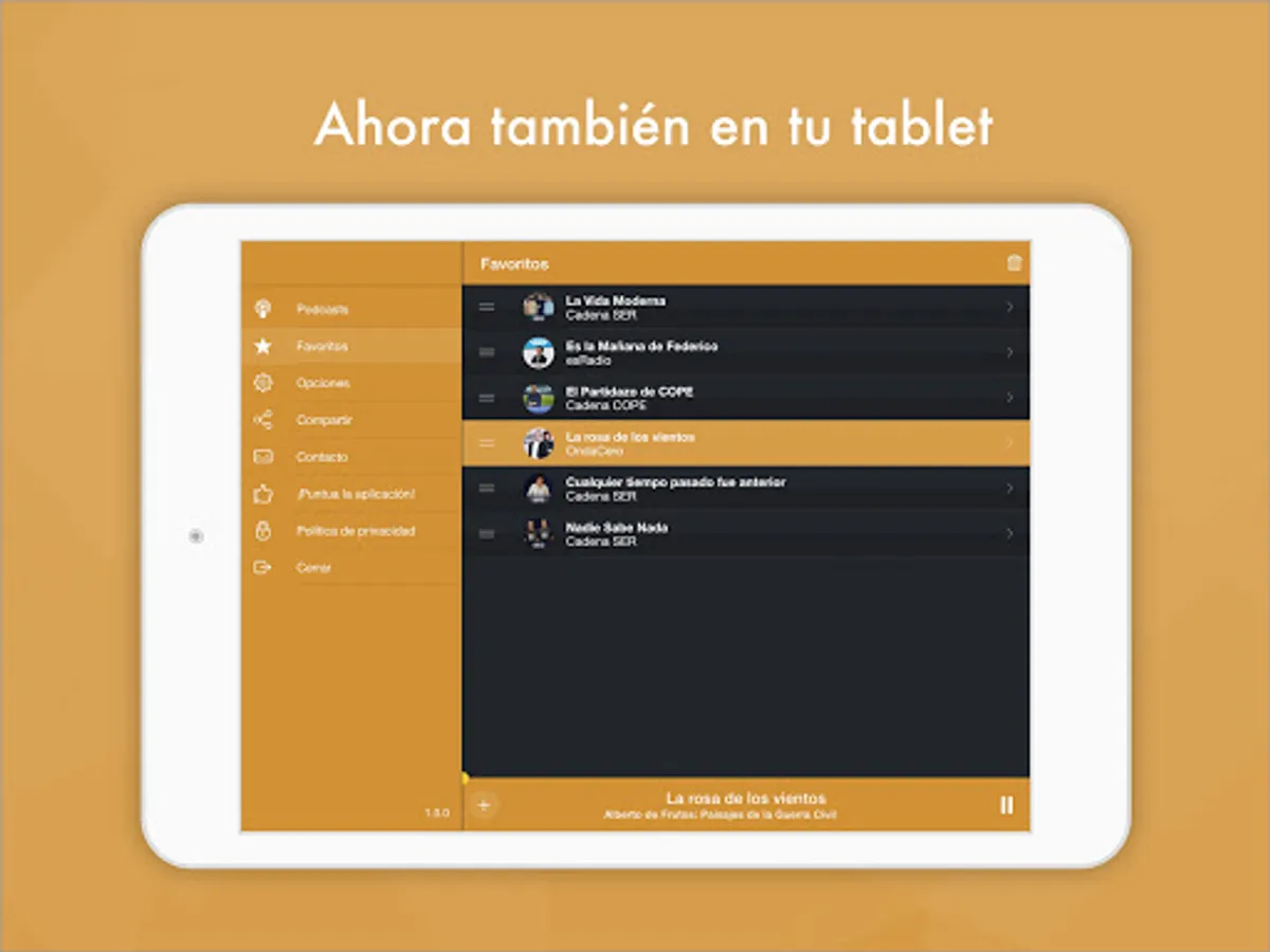 Listen to the best online podcast and the most popular podcasts in Spain in Spanish with our Podcast Player application that includes: El Partidazo de COPE, Nobody Knows Nothing, It's Federico's Morning, Modern Life, Herrera at COPE, The Compass Rose, Any Past Time Was Previous, Mindfacts: Mental Sprains, BE History, More than One, Cristina Miter's Podcast, El Transistor, Understand Tu Mente, La competència - Programa sencer, El Larguero, Julia en la onda, Dieter's Night, The Compass Scobula, Deformed Total Ideal Weekly, The Voice of César Vidal, The Group, The Bunker, Global News Podcast, The Wild Project, Terraza Europa, En Casa de Herrero, White space, Stories in English with Duolingo, 22424. What we play in Bankia, Hour 25, Curiosities of National Geographic History, Game Time, La Cultureta, Here are dragons , La Ventana, CHARLI AND DIXIE: 2 CHIX, TED Talks Daily, Cuarto Milenio (Official), Las Noches de Ortega , Revolutionary Fitness Radio, Crims, Memories of a drum, Infinite Loop (by Applesfera), Practice Positive Psychology, My favorite year, kaizen with Jaime Rodríguez de Santiago, Marketing Online, Almighty, Capital University, Inside the pyramid, TED en Spanish, La Ilusionista, Learn English with English podcast of La Mansión del Inglés-Learn English Free, Arroba Sonora, A secret coffee with Carlos Ríos, Pocket Philosophy, All on the radio, One Book One Hour, HistoCast, CarneCruda.es, The Modern Language, WHAT YOU SAY with Álex Fidalgo, La Linterna, Sound Documentaries, Boss of your life. Charuca's podcast, To live for two days, La Manzana Bordida, Hoy por Hoy, La Brújula, girlslikeyou, 6 Minute Vocabulary, The invisible school, Audiobooks, The Daily, The English We Speak, Carmen Osorio's podcast, 6 Minute English, Four more years, El Francotirarock, A Room of Our Own, Humor on Cadena SER, El món a RAC1, Somos Estupendas, BBVA Aprendemos Juntos, Emilcar Daily, Despeja la X (by Xataka), 6 Minute Grammar, Hotel Jorge Juan , Books for Entrepreneurs, Richard Vaughan Live, THE RESISTANCE by David Broncano, Territorio Negro, Levántate y Cárdenas, A Bit of Optimism, Without Complexes, Las Tallas de Applesfera,, El Primer Palo, El Cine en la SER, Biotopía, Grupo Risa , Looking for a Light, Coffee Break: Signal and Noise, RNE Documents, El Mundo Today, Divina de la Mente, mixx.io - daily technology podcast, Applelians, Intrépidos, The Yes Theory Podcast, Las Mñanas KISS, Undertake Learning, Freakonomics Radio, Your money never sleeps, Let's talk about movies ...