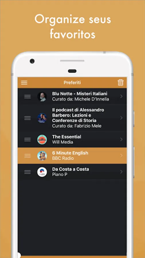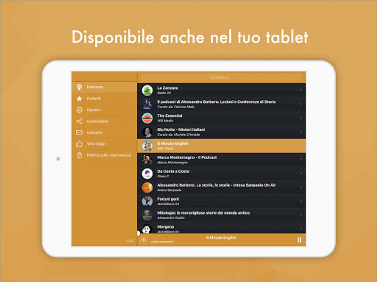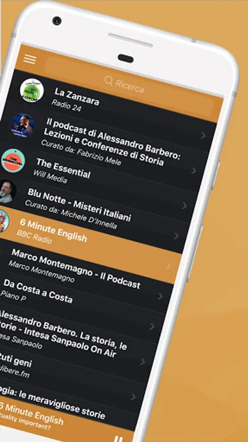 Listen to the best podcast online and the most popular podcasts in Italy in Italian with our Podcast Player app which includes: La Zanzara, Cerbero podcast, Il podcast by Alessandro Barbero: History Lectures and Conferences, The Essential, Blu Notte - Italian Mysteries, 6 Minute English, Marco Montemagno, Da Costa a Costa, Alessandro Barbero. The story, the stories - Intesa Sanpaolo On Air, Mythology: the wonderful stories of the ancient world, Morgana, TED Talks Daily, Corriere Daily ...
