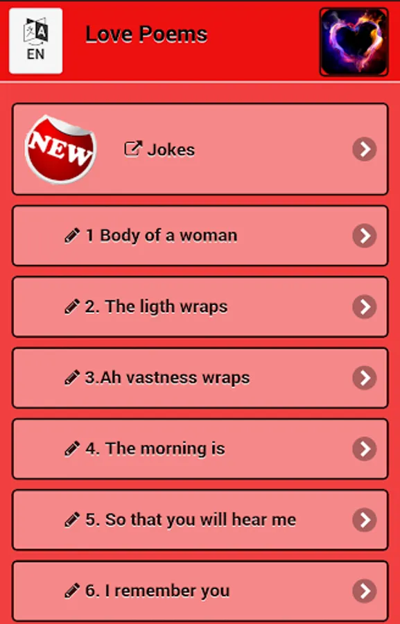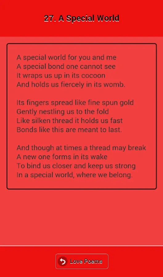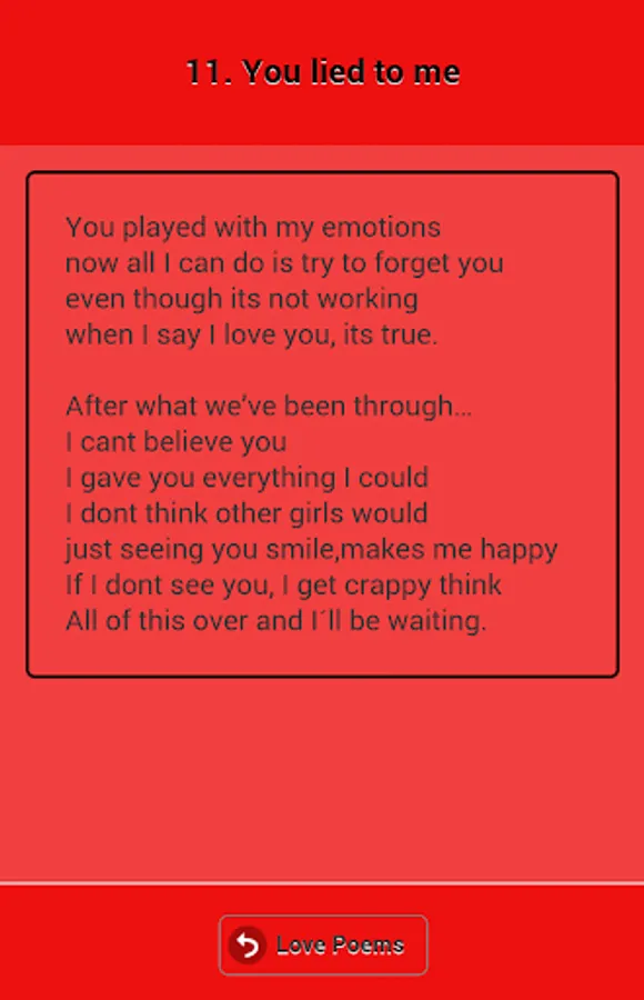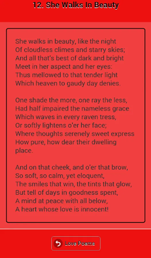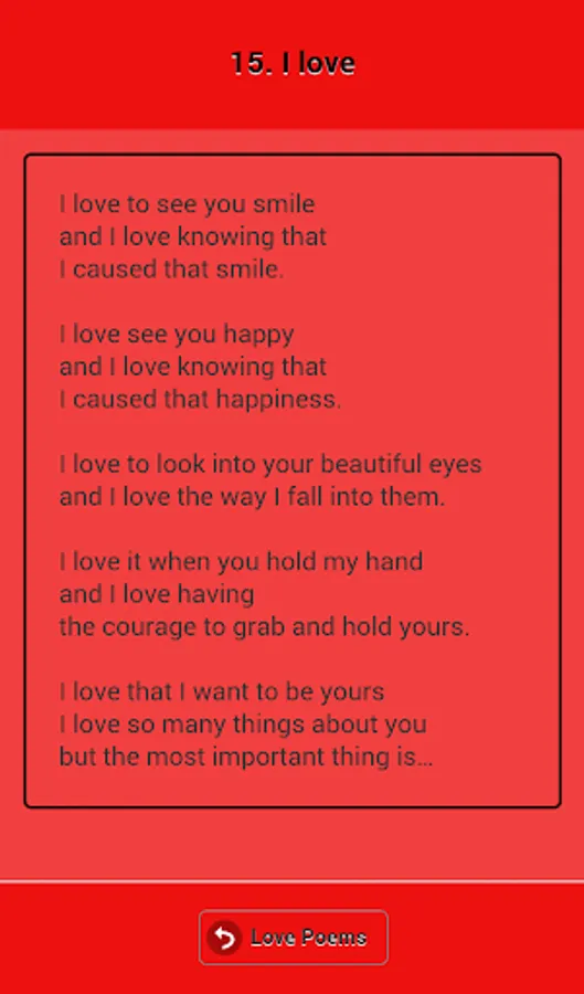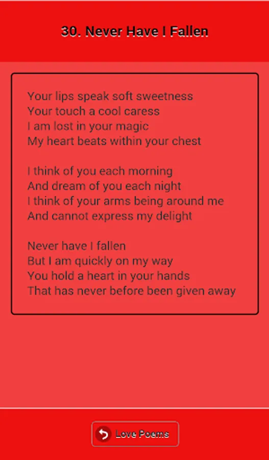 In this application for android love poems have collected the best and the most beautiful love poems. Do not waste anymore time searching quotes and love poems, with this application you have a variety, poems by various authors and short poems to remember and tell your person or loved one in a romantic restaurant for a fabulous dinner. Also the you can share the social networks and the you can download on your cellular phone or tablet.