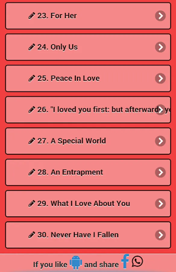 Remember Poems of Love's completely free and you can share it by Whasapp and Facebook with your friends.