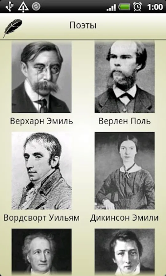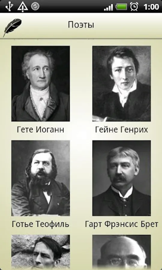 ✔ Byron George Auguste Barbier, J. Beranger, Robert Burns, William Blake, Charles Baudelaire, Richard Brautigan, Charles Bukowski, Emile Verhaeren, Paul Verlaine, William Wordsworth, Emily Dickinson, Johann Goethe, Heine, Heinrich, Theophile Gautier, Francis Bret Harte , R. Jeffers, Rudyard Kipling, John Keats, Corso G., Lena H., D. Leopardi, G. Longfellow, Mickiewicz, A., Moore, Thomas, Marianne Moore, Ogden Nash, guys Evariste, Sully Prudhomme, Ezra Pound, In Edgar Arthur Rimbaud, Taras Shevchenko, Percy Shelley, Friedrich Schiller