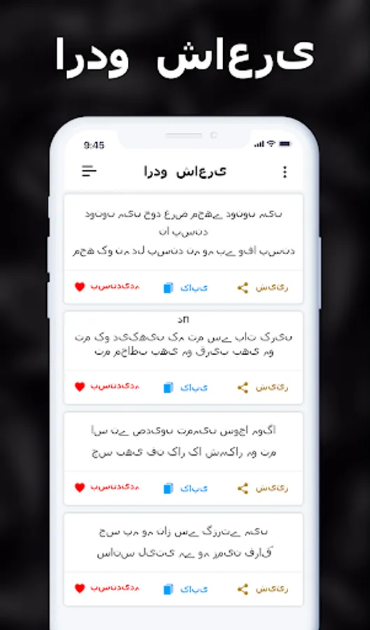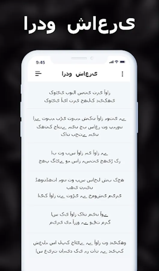 We provide a simple & elegant way to share Urdu Shayari (Poetry) with your lovers and friends. In this application there is a huge collection of Urdu Shayari (Poetry) in Urdu.