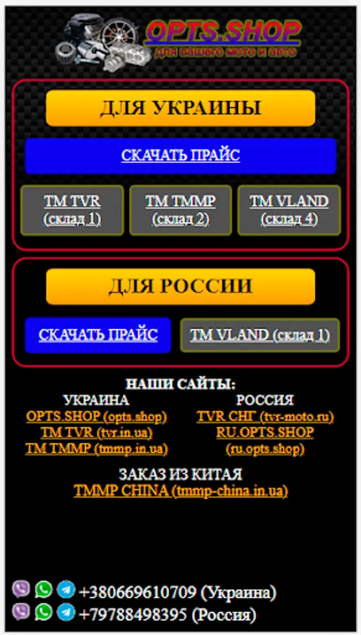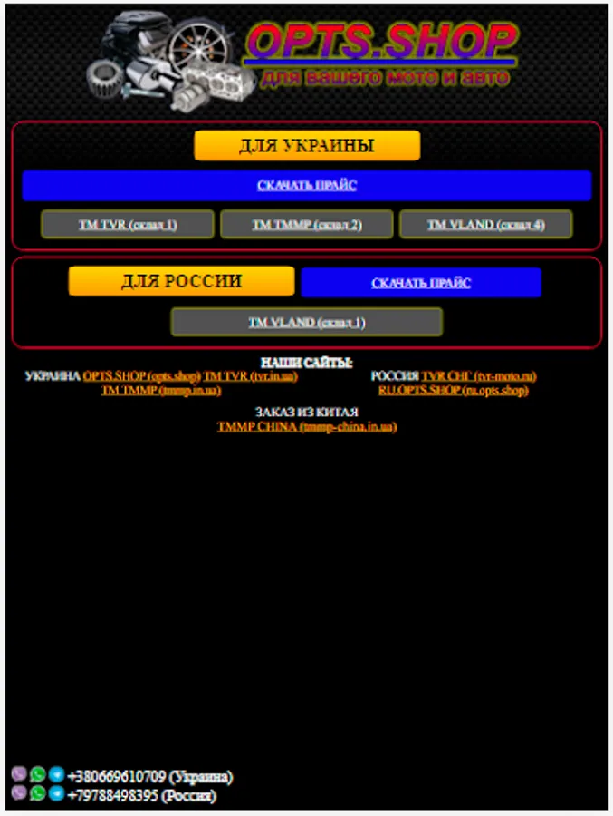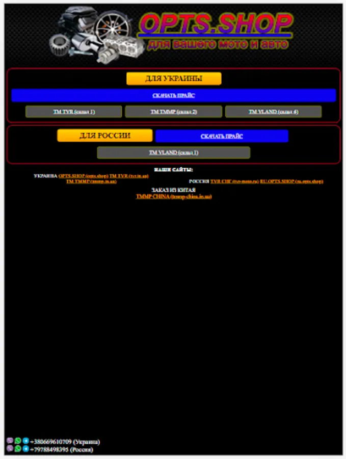 OPTS.SHOP is a Wholesale Online Store engaged in wholesale of spare parts for more than 10 years in the Ukrainian market. We import spare parts from China and other countries in containers to our warehouses. We are also engaged in the separate supply of containers with spare parts to our large wholesale customers. We offer to wholesale, small-scale wholesale customers the delivery of our products by courier services. We offer spare parts for motor vehicles: scooters, mopeds, motorcycles, Chinese, Japanese and Soviet production. Spare parts for universal motorcycles, ATVs, snowmobiles. Spare parts for chainsaws, brushcutters, trimer, walk-behind tractors. Accessories, equipment, oils and chemicals, the range is constantly expanding, we already have more than 20,000 positions for motor vehicles.