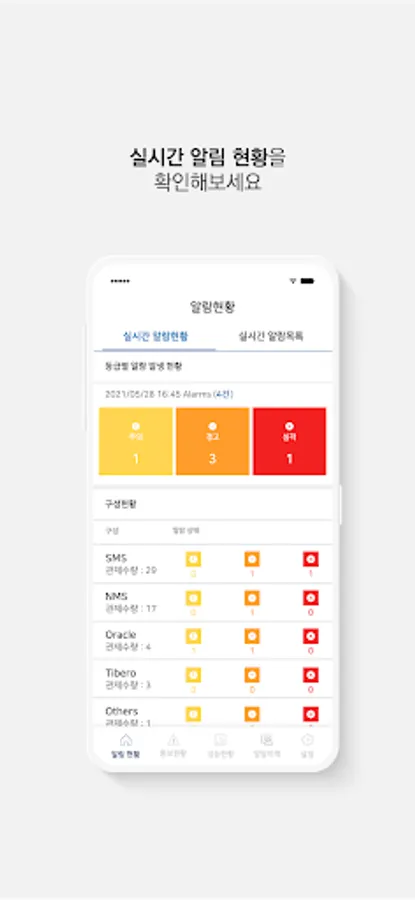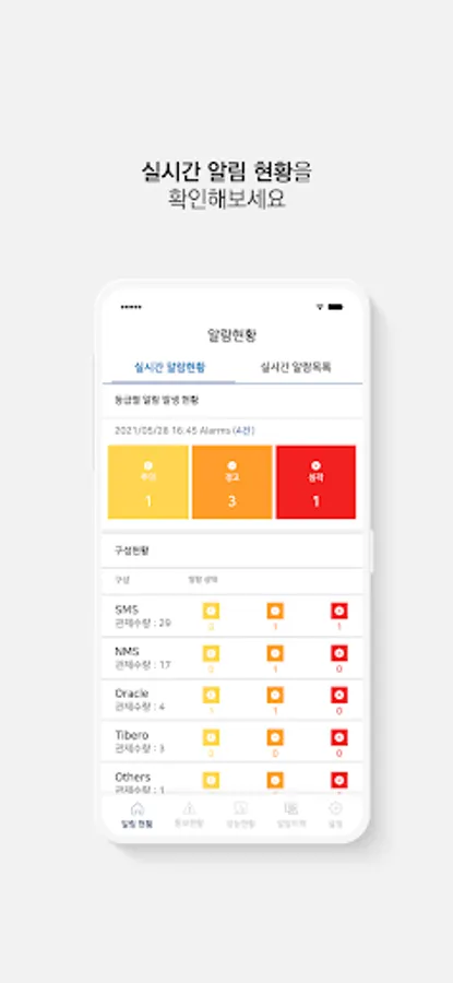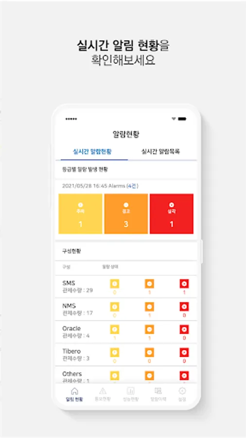 - Alarm status: Alarm occurrence status by grade, configuration status of the lower 3 grades by equipment