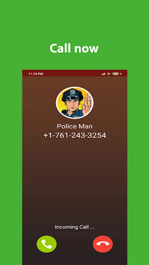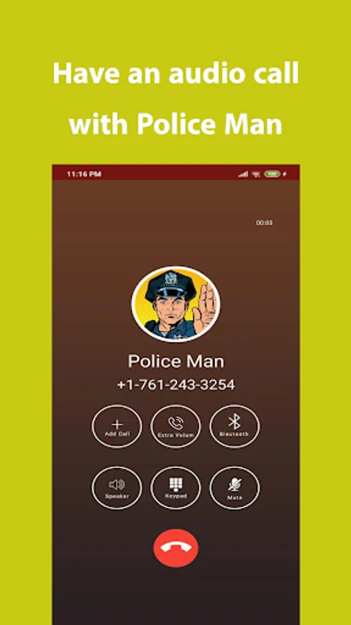 Fake Audio call from Police Man is a simulation prank app that fakes incoming calls . By a simple click you can go in a fake call with Police Man , it’s an easy app in order to entertain yourself and prank your friends and family and see their reaction , the call looks so realistic and they will believe that Police Man is really talking to them.