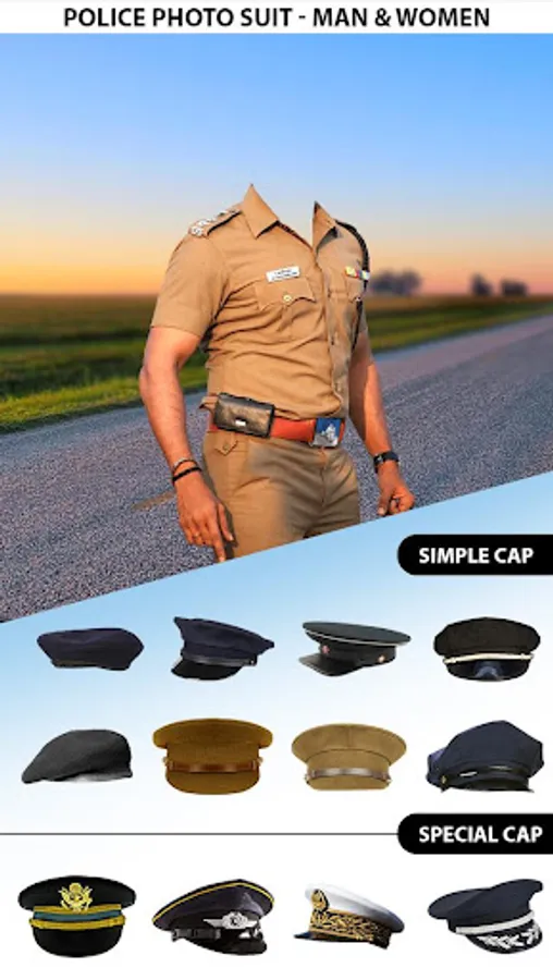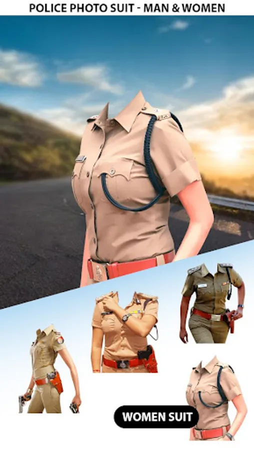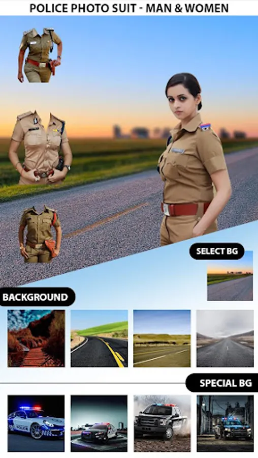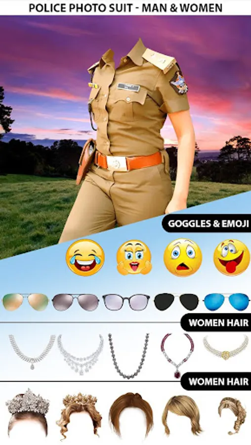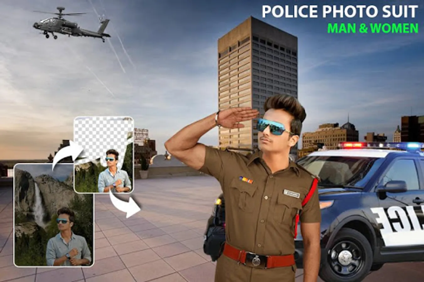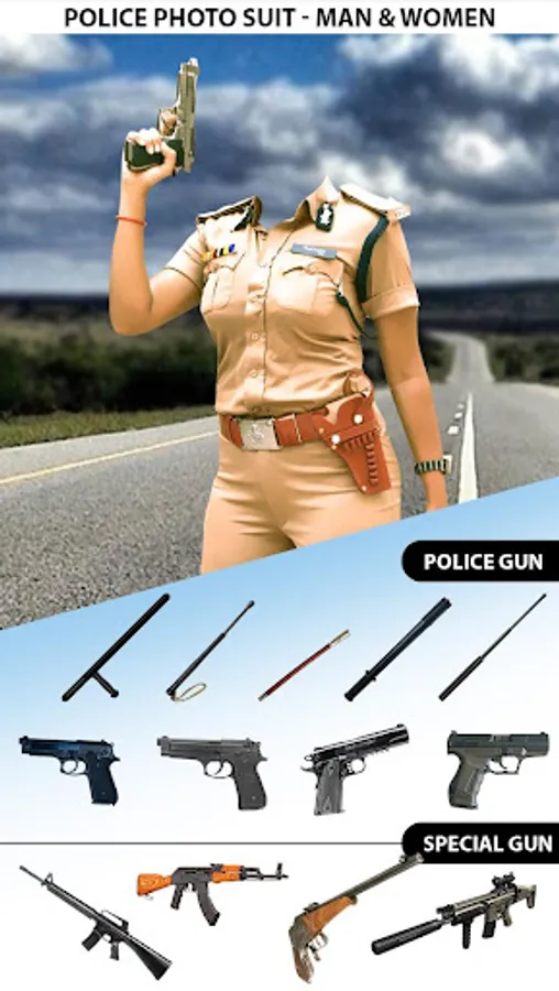 Police Photo Suit both men and women app which have high quality police special background images and amazing stickers for photo editor police getup change like police caps, set gun, police cars, police bikes.