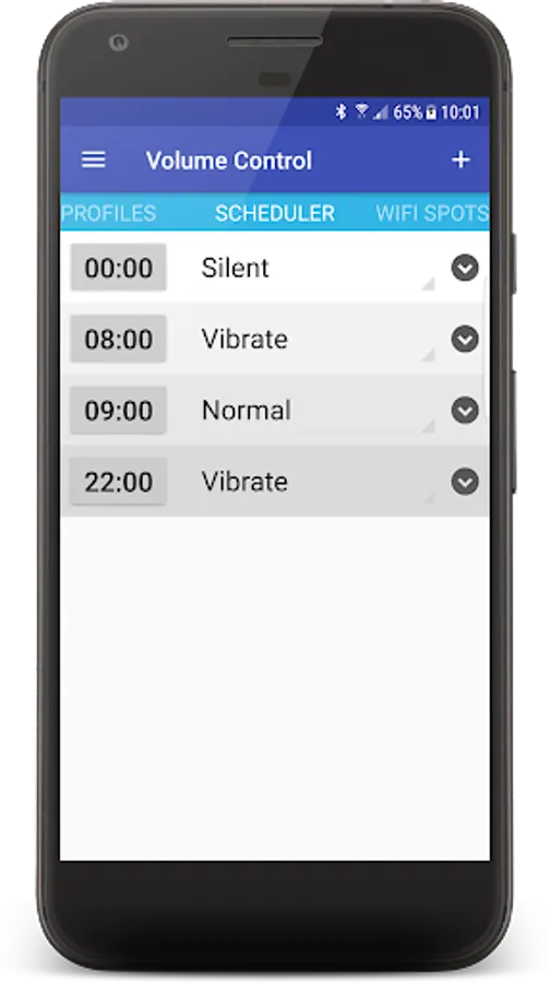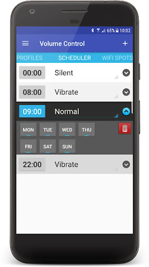It's very useful if you have to switch you volume every day between silent at the night, vibrate at the work and normal at the rest of the day. You can schedule any profile to be applied in any time you need. Unlimited number of schedules can be assigned to every profile.