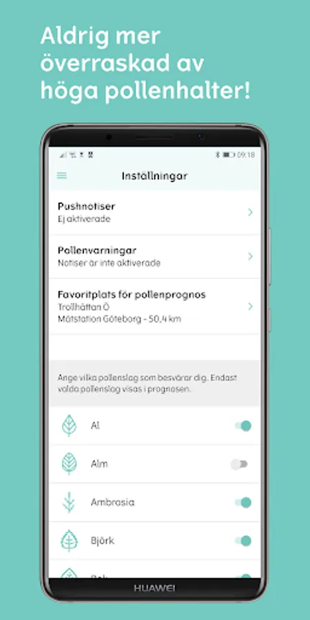 Set which pollen types to display in your forecast and activate pollen warnings to receive push notifications when changing pollen levels at the selected location.