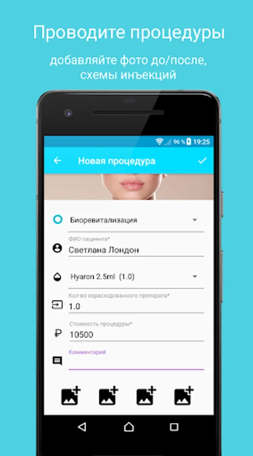 * Attaching photos to procedures (before / after, injection regimens, etc.)
