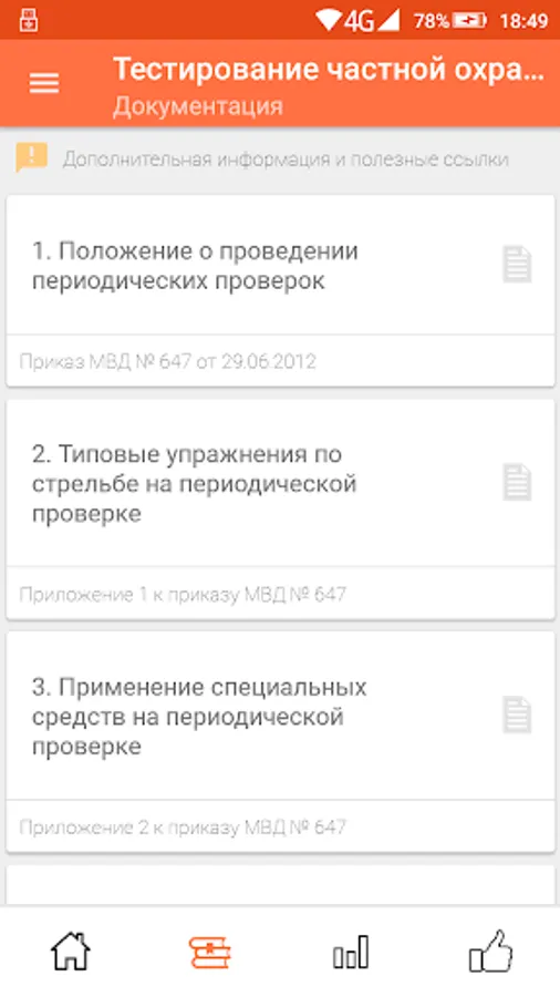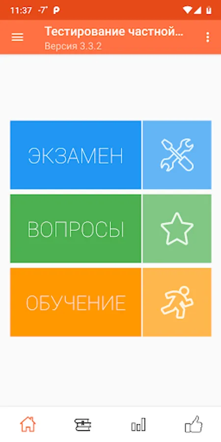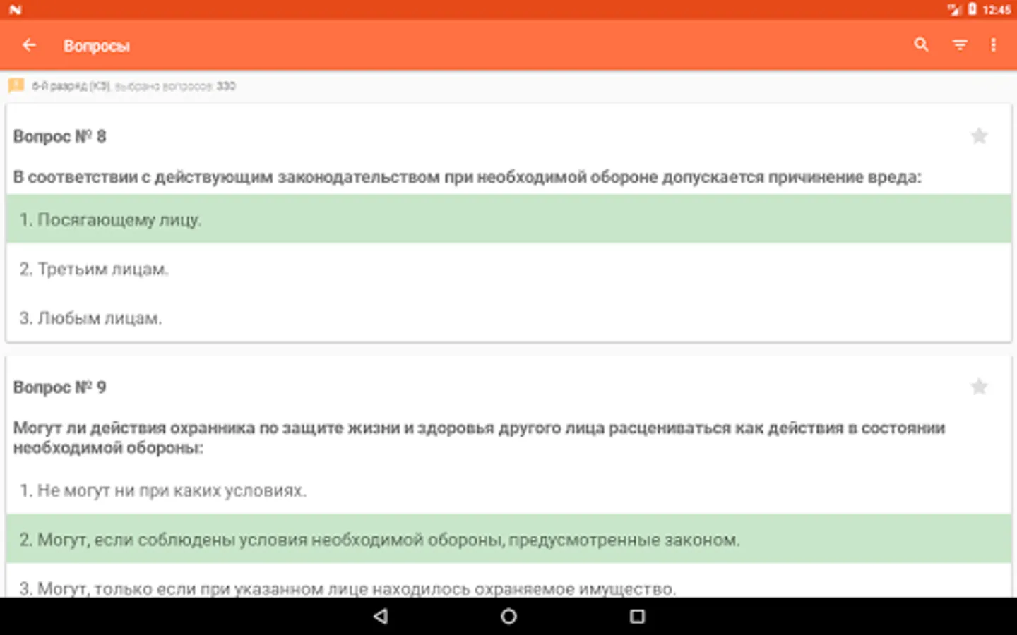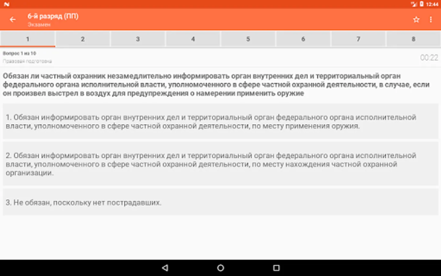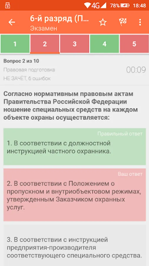 The purpose of the program is to prepare private security guards of the 4th, 5th and 6th categories for testing and passing an exam or periodic inspection. The program allows you to take a test using a currently relevant list of questions. Testing is divided into categories.
