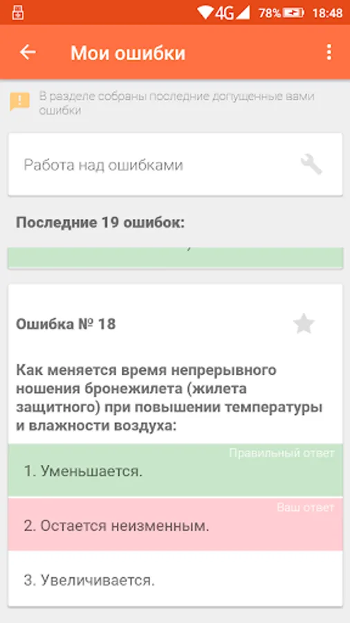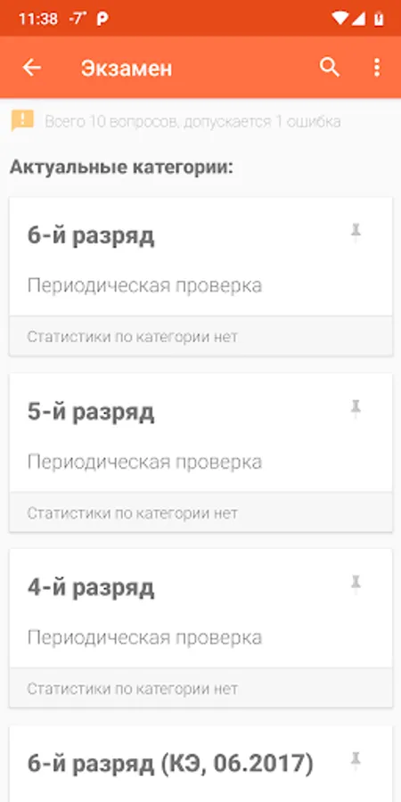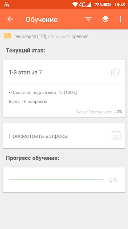 - “Training” mode, which allows you to study all the questions of the selected category step by step