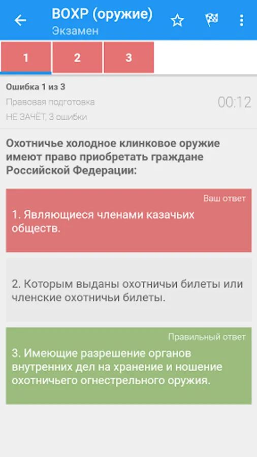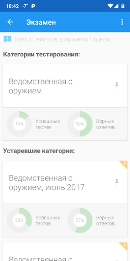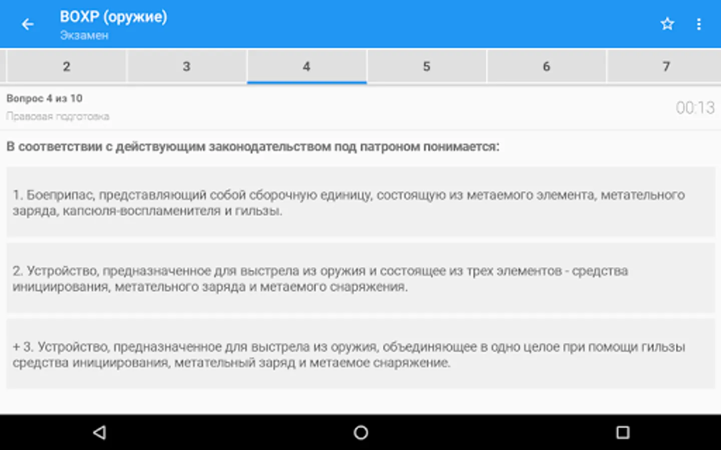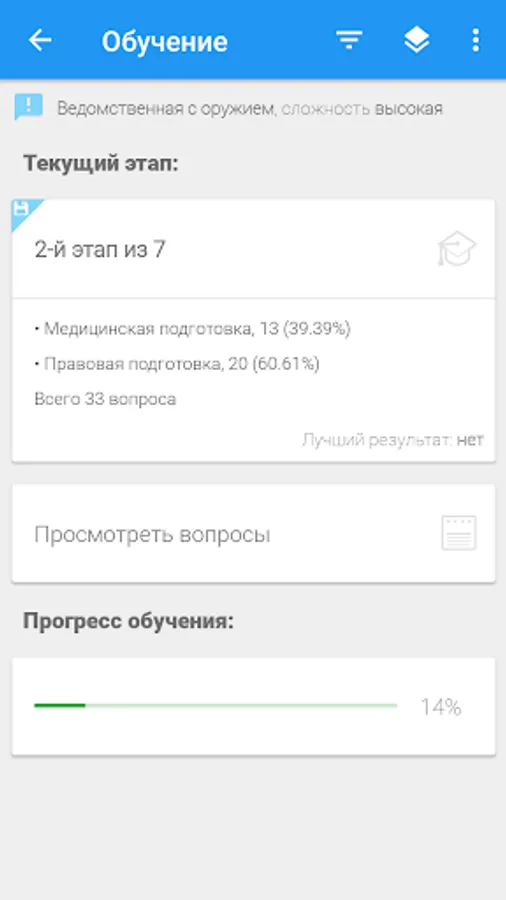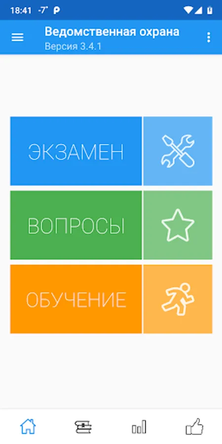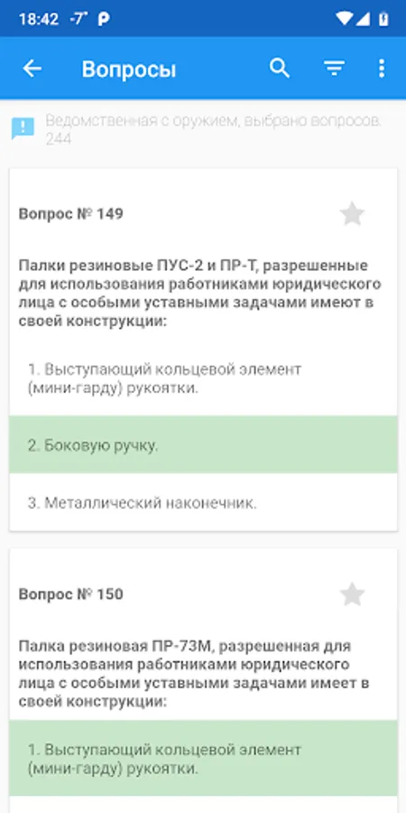 The purpose of the program is to prepare employees of departmental security, employees of legal entities with special statutory tasks for testing and passing periodic inspections. The program allows you to be tested on the current list of 244 questions. Also in the application there are questions for departmental security with special equipment (without weapons).