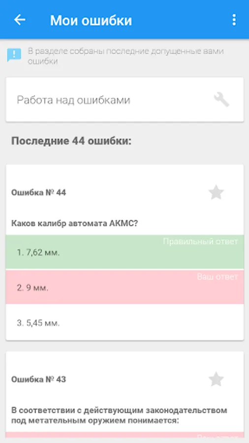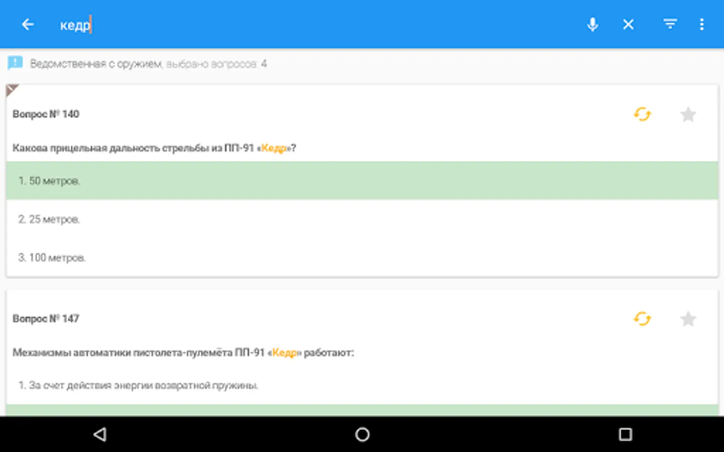 - "Selected questions" mode, which allows you to create a list of favorite questions and then pass the test according to the generated list