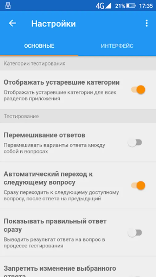 - "Topics" mode, which allows you to take a test on selected topics of the category