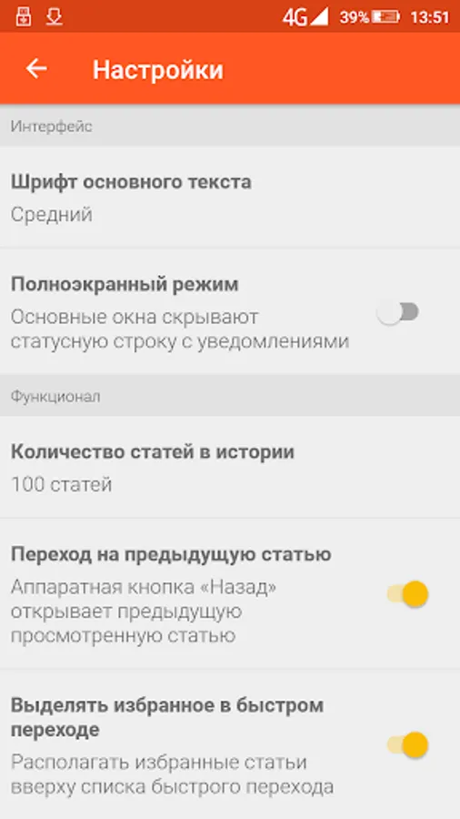 - Browsing history: the application stores the history of viewing articles, forming a list and sorting the history by the date of viewing