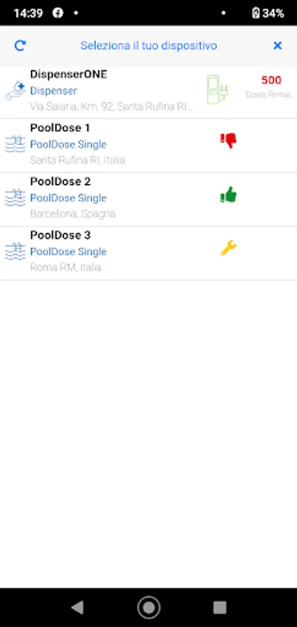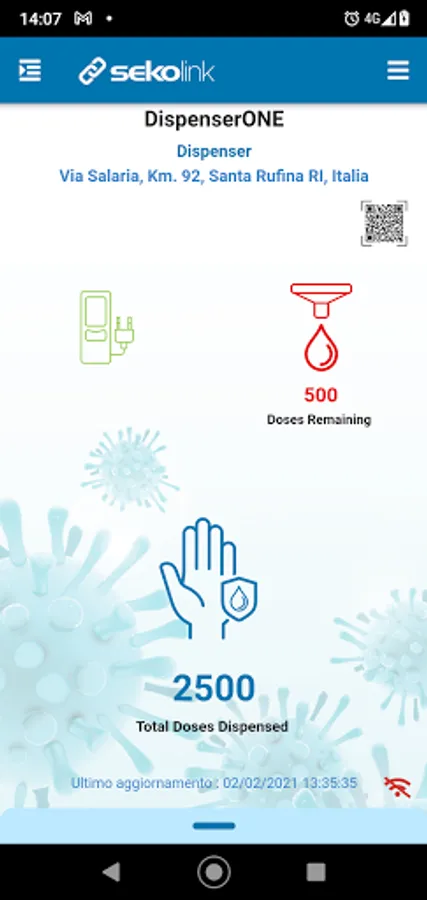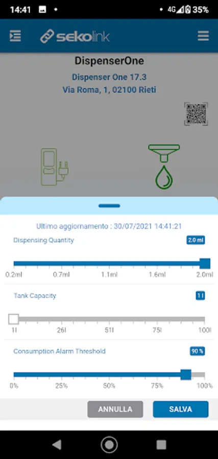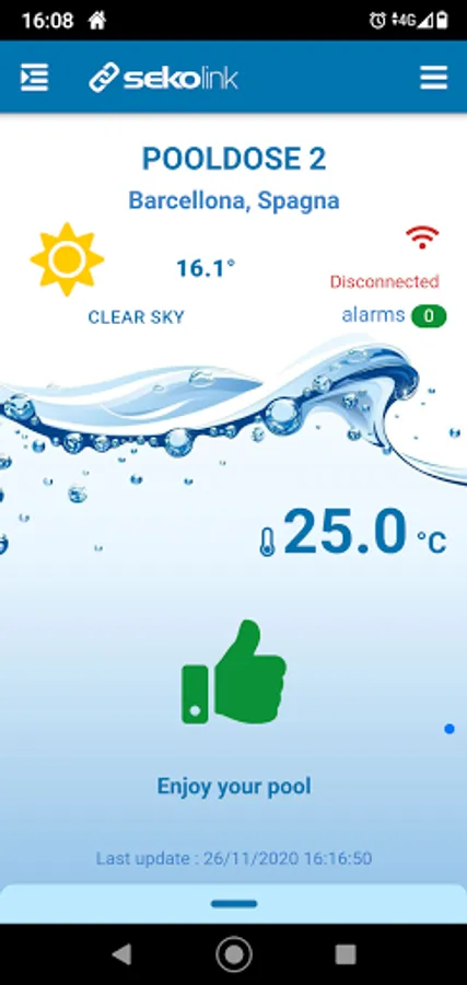 Expressly designed for the final users, SekoLink is an intuitive APP that grants users quick and easy access to their own SEKO devices installed in the field, to visualize at a glance the health condition of their installation and to have access to relevant parameters at a swipe, also giving some limited control functions. Intuitive icons show immediately the current situation of the plant, with an upward thumb if everything is going well, a downward thumbs if some parameter is out of the admitted range and a wrench if it’s the case to call technical service. Depending on the applications, different parameters are used to evaluate the health status of the installation and to give the right advices to the users. The APP also offer some limited control actions, such as starting or pausing the dosing system or, in some case, switching to a different dosing program, but is thought to let the final user to operate in total safety, without giving him the possibility to change, by mistake, critical parameters of the devices, whose management is left to technicians.