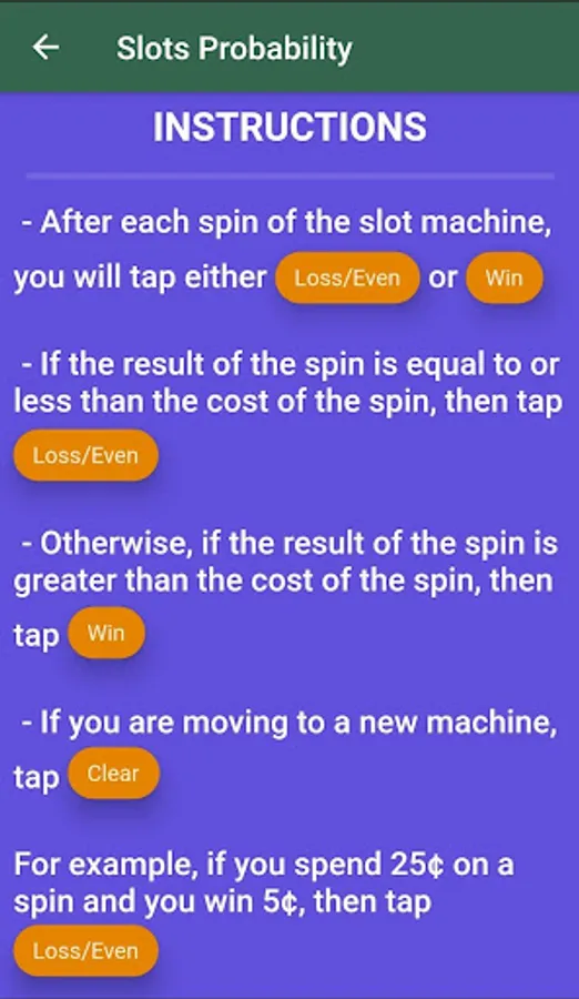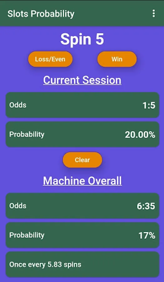 After many years of calculating in my head how often a slot machine pays out, I finally decided to create a simple app to track it. The purpose of this app is to determine the payout probability of a slot machine. See the Instructions screen in-app for more details.