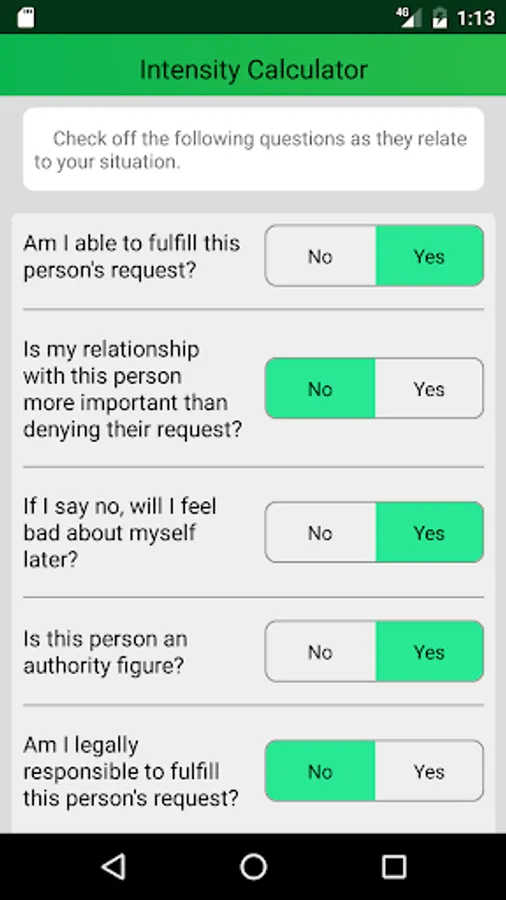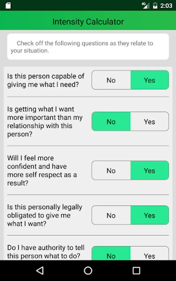 • Intensity Calculator: Until you really get a feel for how you realistically stand in regard to others, you may be drastically off when it comes the intensity you ask for what you want, or say no. For instance, if you're an employee, and you normally get a yearly raise, and it's been 13 months, then you wouldn't want to scream at your boss. But if it's been 3 years, you definitely would want to increase your intensity over the 13 month you. Use this calculator to figure out how intensely you should communicate something to another. Especially during emotionally charged situations, your natural instinct may be way off. So you may find yourself using this calculator time and time again.