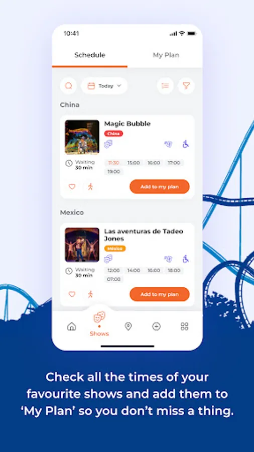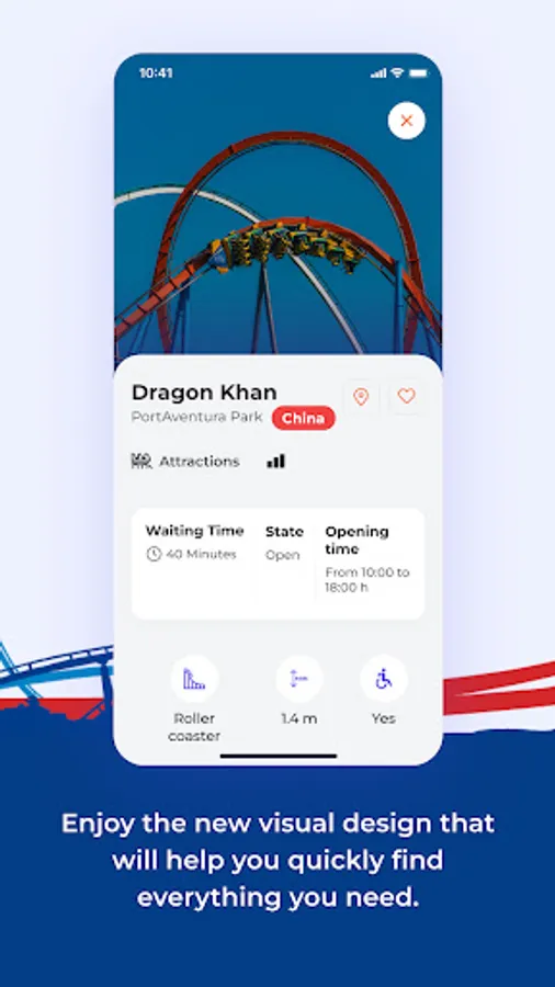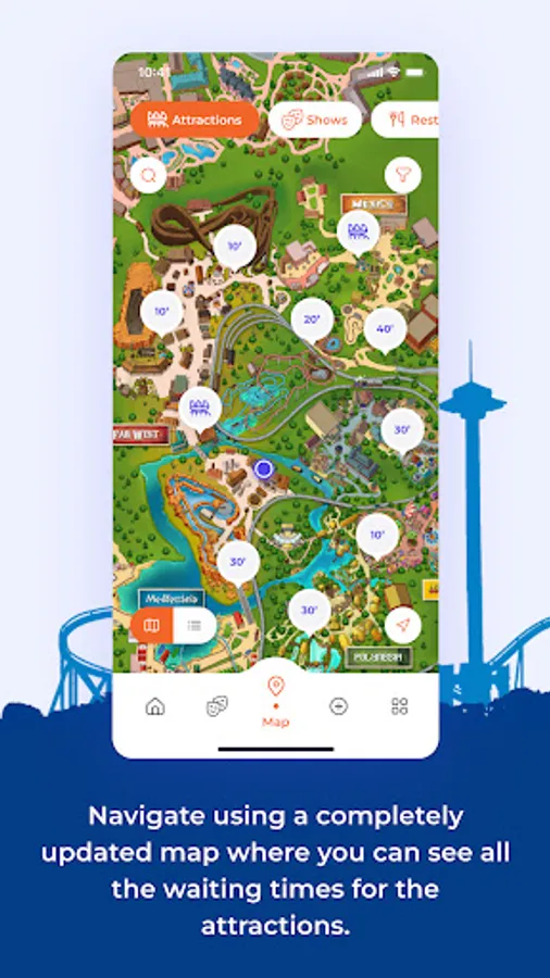 Navigate using a completely updated map where you can see all the waiting times for the attractions.