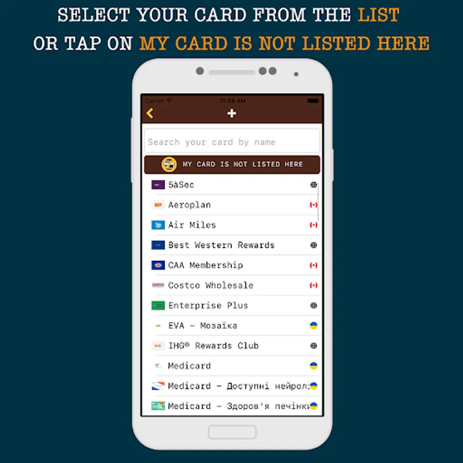 * Dozens of popular bonus cards and loyalty programs from around the world, including Starbucks Rewards, 7 Eleven - 7Rewards, Aroma Espresso Bar, Tim Hortons - Tims Rewards, 5àSec, IHG Rewards Club, Wyndham Rewards, Aeroplan, Air Miles, Triangle Rewards, Costco Wholesale, PC Optimum, Petro Points, Scene, as well as from Ukraine: Ajour, Zolotiy Vik, Epicenter - Vygoda, Novus, UkrZoloto, Silpo - Vlasny Rahunok, Brokard and from Russia: SportFood, Pyatyorochka, Perekryostok, Acoola, Adamas, Novikov, Yahont, India: India Bazaar, Payback, SBI Rewardz, and many others.