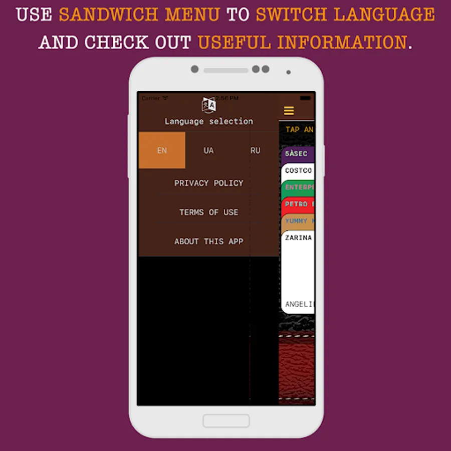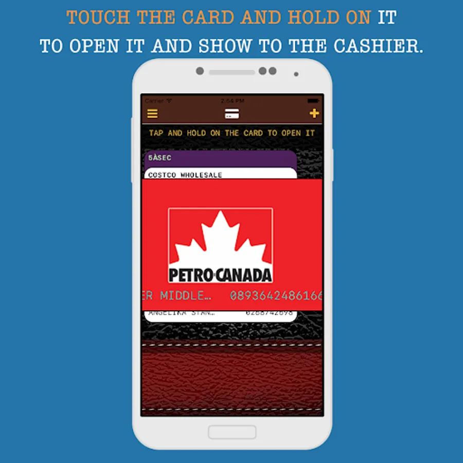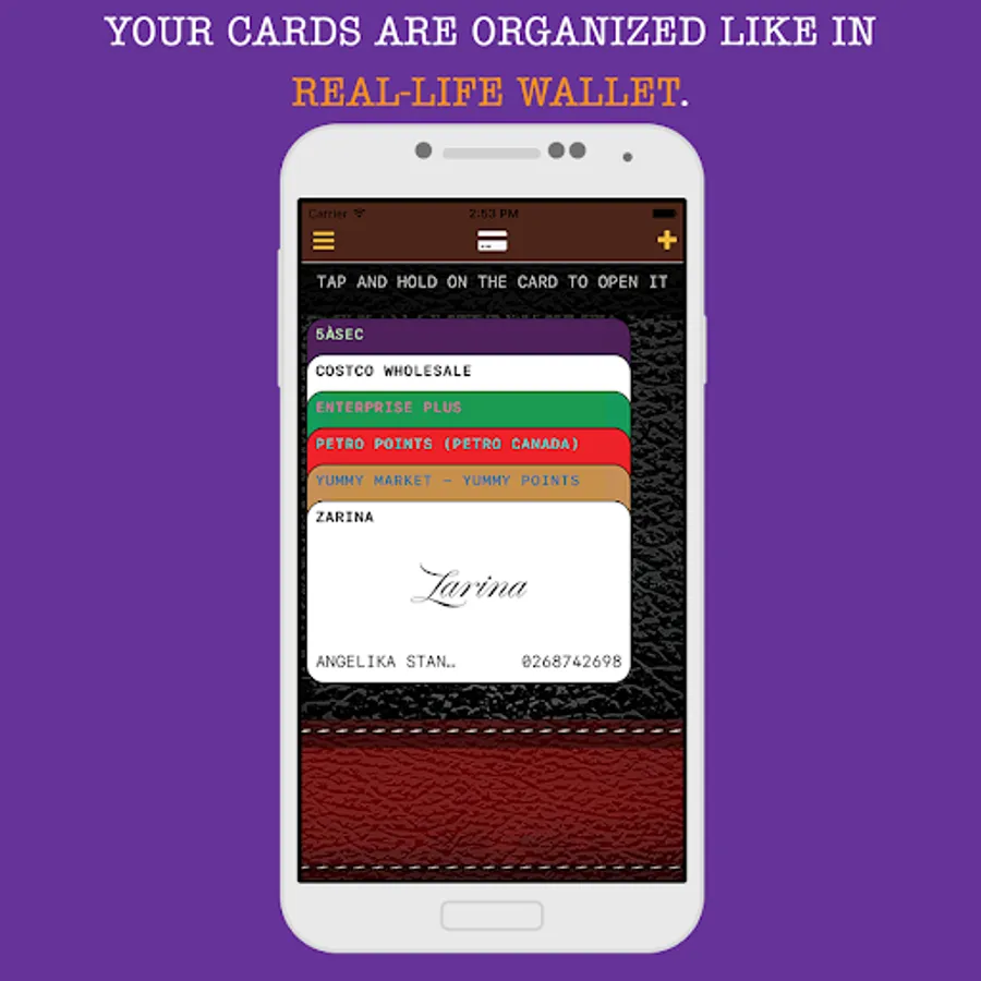 "Pull out a card" from your PorteLoyal wallet is super-easy! Just touch it and hold your finger for a short time - the card will “open” and appear on the screen.