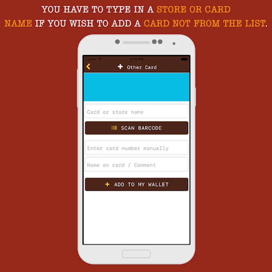 To facilitate the selection, you can select your country and / or category of cards from the list, as well as to use the search by card or store name. Even if your card is not in the actual list, you can add it by tapping on the "My card is not listed here" button and enter the name of the card. We add new cards to our list weekly! After selecting a card from the list, scan its barcode or QR code. If for some reason you cannot scan the code, or if there is no code on the card, just enter it manually.