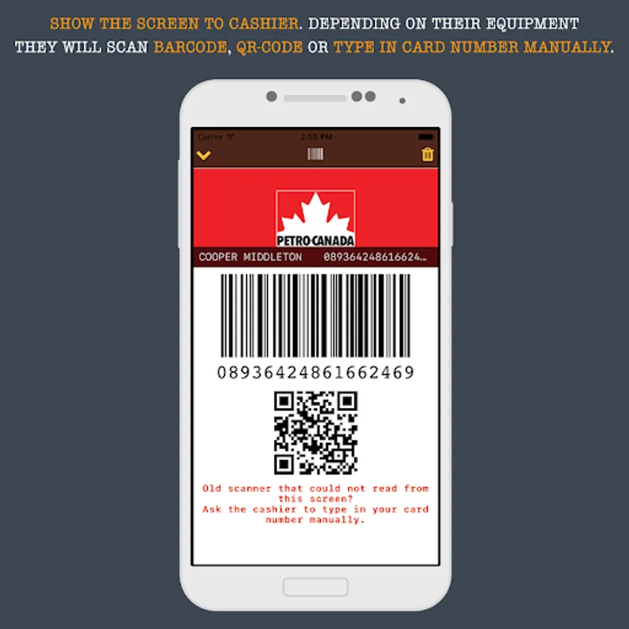 * The app shows both barcode and QR code for different type of store scanners.