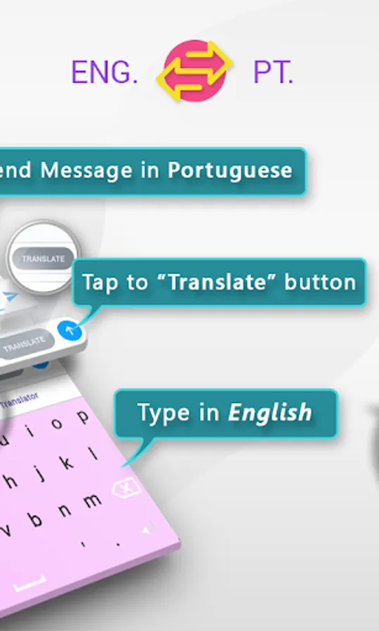 If you speak English and are texting a person speaking Portuguese, Portuguese English Translator Keyboard allows you to type your message in English and automatically translates your message into Portuguese. Where as if you speak Portuguese and are texting a person speaking English, English Portuguese Translator Keyboard allows you to type your message in Portuguese and automatically translates your message into English.