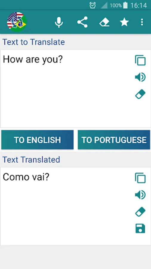First you type your words to translate and then you choose among 2 buttons if you want your text will be translated in portuguese, you tap portuguese and if you want in english you tap english.
