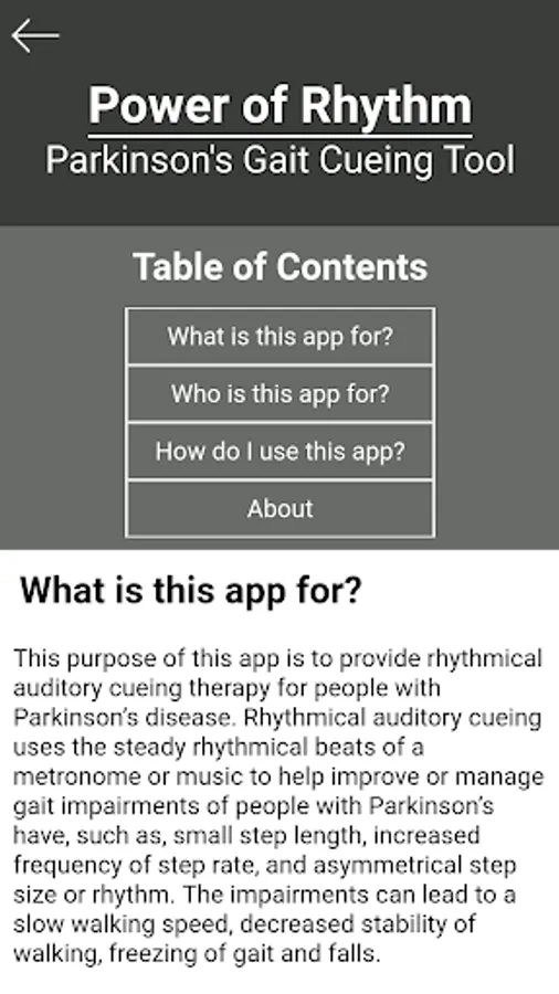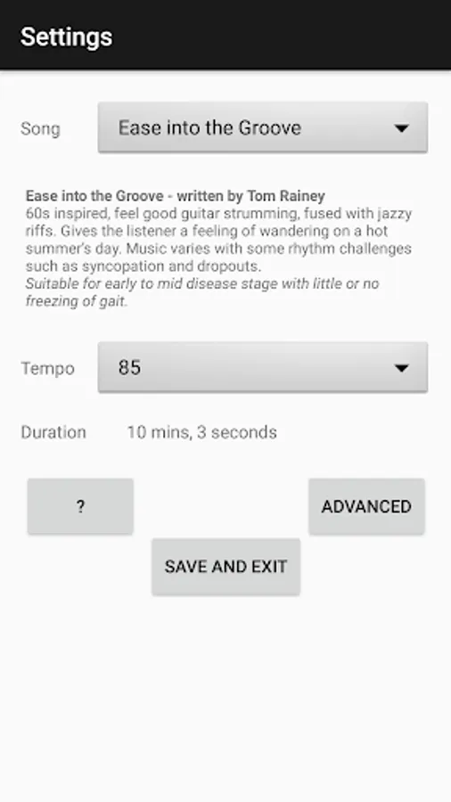 This application is specifically designed to aid in the treatment of Parkinson's. The application contains a selection of original songs that have been chosen to fit a wide cross-section of musical tastes, and the playback of these songs can be adjusted to suit the individual patient.