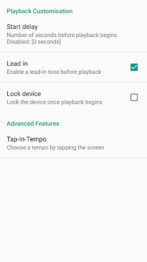 The songs themselves can be time-scaled to suit a range of Beats Per Minute (BPM), and can be modified with delays and lead-in tones. There is also a metronome function.