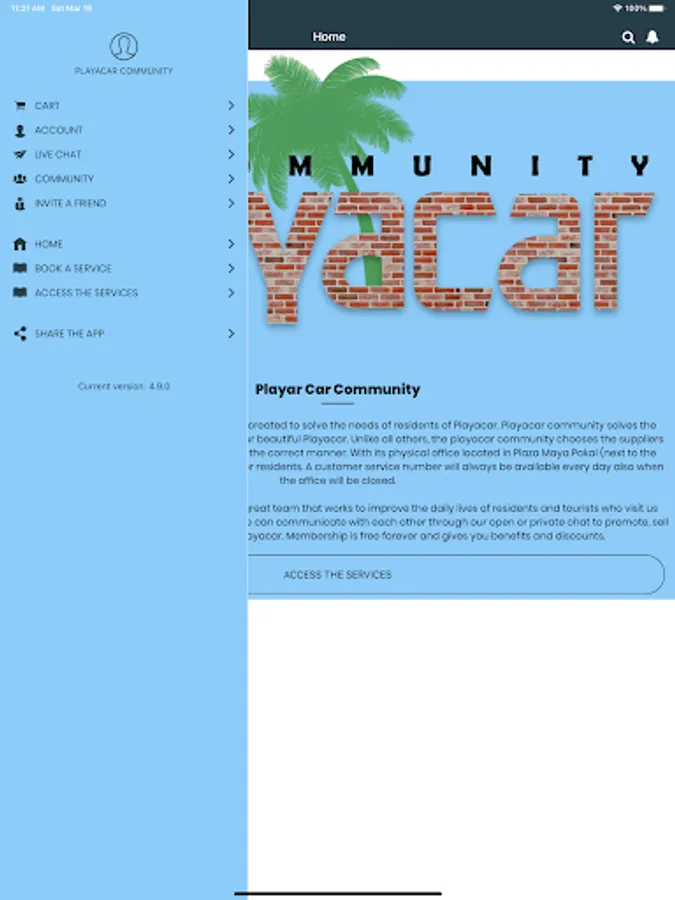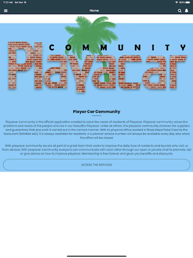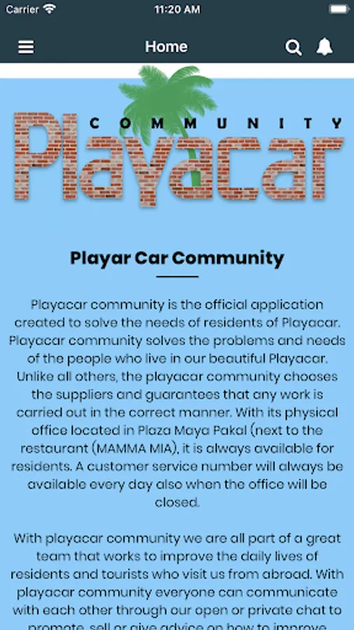 Playacar community is the official application created to solve the needs of residents of Playacar. Playacar community solves the problems and needs of the people who live in our beautiful Playacar. Unlike all others, the playacar community chooses the suppliers and guarantees that any work is carried out in the correct manner. With its physical office located in Plaza Maya Pakal (next to the restaurant (MAMMA MIA), it is always available for residents. A customer service number will always be available every day also when the office will be closed.