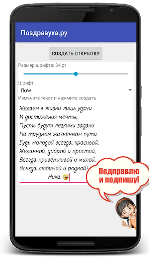 More than 120 thousand author's congratulations for all occasions and 500 postcards. 2 million users annually send our congratulations, please your friends, relatives and colleagues. The Postcard Maker will help you create absolutely unique postcards with your signature!