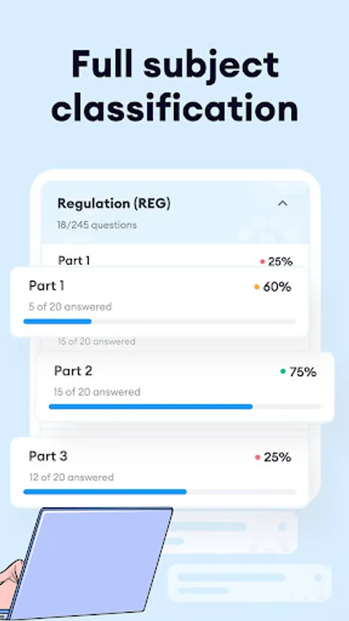 CPA Exam Prep 2023 provides everything you need to pass the exam with confidence. Our experts have carefully studied the content of previous exams and the latest exam requirements, and have expertly categorized all of the subjects within the exam so that you can practice in a more targeted manner to suit your situation.