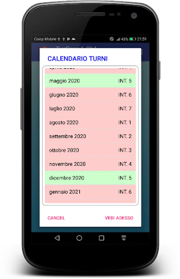 simple and immediate display of shifts, in an integrated textual form by a color code for immediate understanding. The app also includes a calendar that shows, for all shift workers, previous and current months.