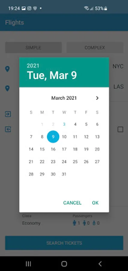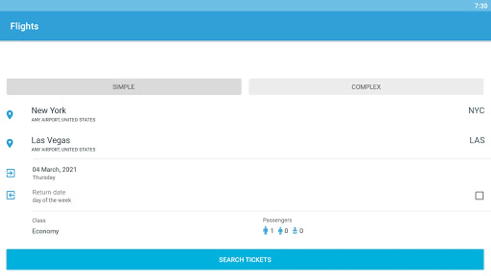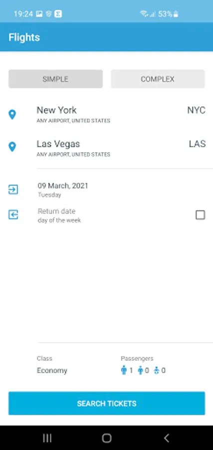 - Two kinds of search air tickets – simple (roundtrip / there and back) and difficult (transfer and different days)