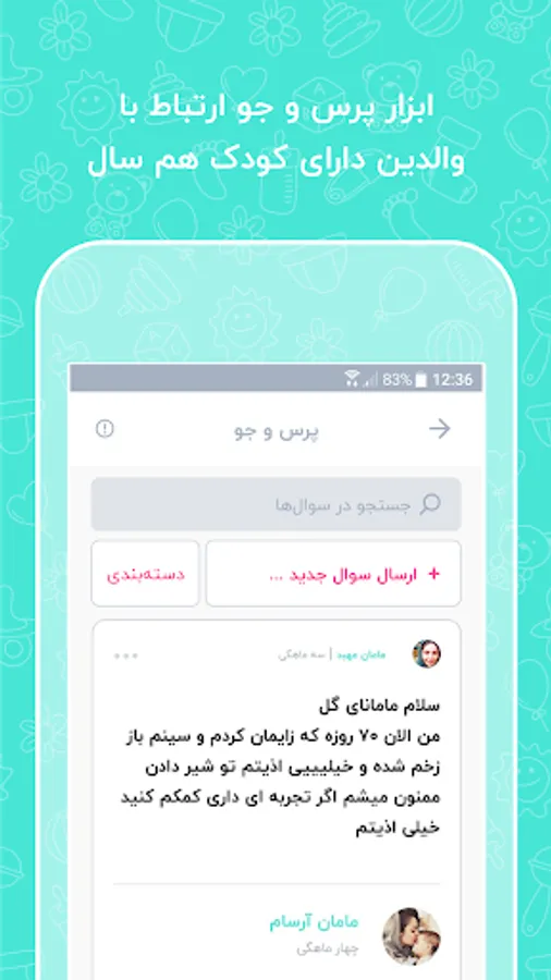 Inquiry: In this section you can contact parents who have a child with your child or if you are pregnant, contact pregnant mothers. Ask them questions and answer them. These can be questions about pregnancy, child rearing or baby health.