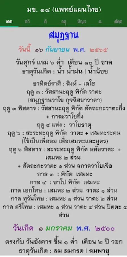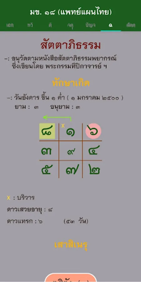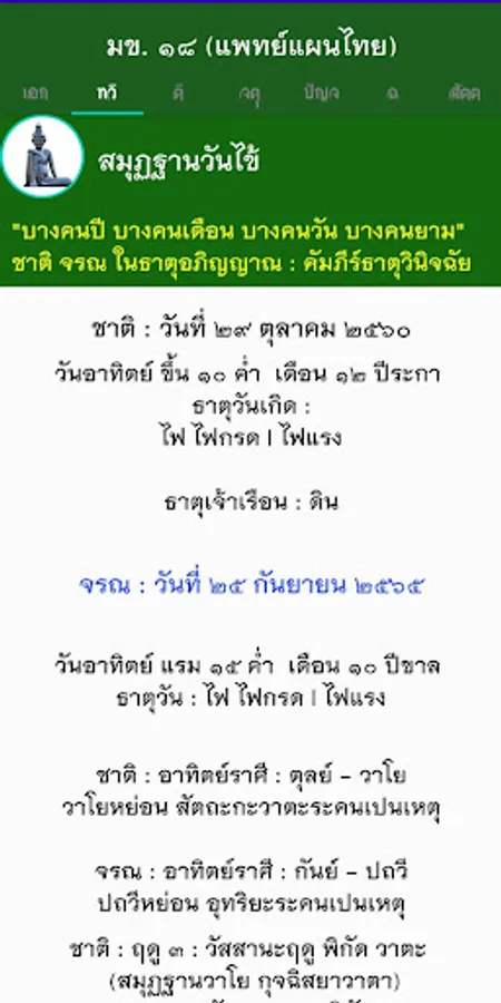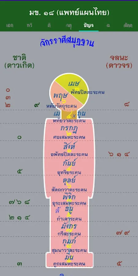 for students or those interested in studying Thai traditional medicine which already has the basic knowledge of Thai traditional medicine and or have some astrological background for ease of use Instead of carrying a 100-year calendar* by choosing the date of birth to check the element of the household as a basis for diagnosis in Thai traditional medicine It combines the display of the astrological zodiac chart (human form) showing the position of the stars calculated according to the Sun Yat scriptures. and the layout of the Sattaphidhamma For the diagnosis of traditional Thai medicine in astrology (seasonal and cosmic relationship of elements/solar, lunar, operated) included.