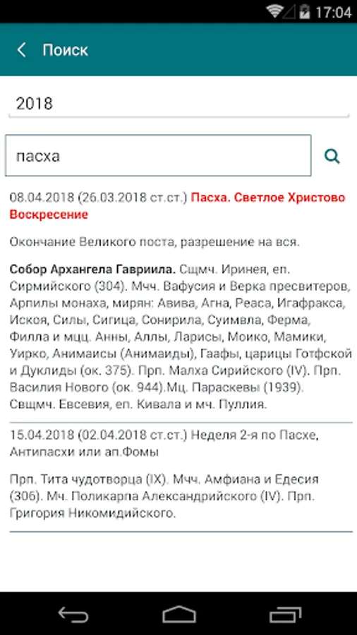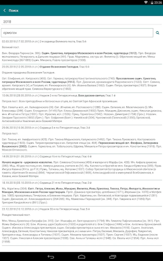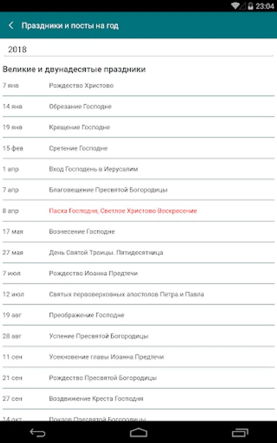 - Output in a single list for the selected year of all great and twelve great holidays, fasts, days of remembrance of the dead and continuous weeks;
