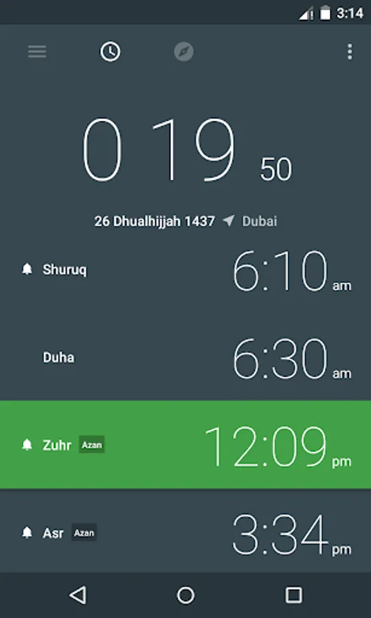 Several athan options on mobile phones for Fajr, Zuhr, Jummah, Asr, Maghrib, Isha.