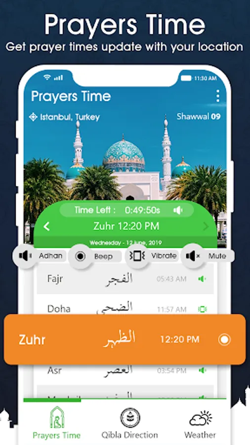 مواقيت الصلاة and all five times prayers fajar, Zohar, Asar, Maghrib and Eshaa and as well the additional salat like tehajud and others are a timely line up with perfect want, in current location clock by setting a complete Muslim namaz time table. Islamic Salah timer is a continuous alert of صلاةfor مسلم. Islamic namaz alerts are given to Muslim for not to forget نماز in the busy schedule. Namaz calendar 2019 is an errorless prayers timetable with namaz notifications and نمازalerts with correct وقت الصلاة.