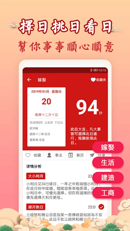 ★ Eight-character selection day: According to Zhou Yi’s numerology and folk customs, the Ji Li Wan Calendar carefully selects the appropriate occupant’s horoscope, and conducts scoring analysis to let the participants know what time (some time) to do things. More auspicious.