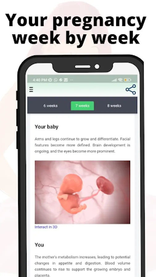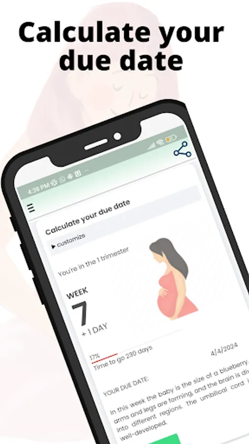Experience the ultimate pregnancy journey with Pregnancy by Week. Stay informed and engaged as you effortlessly track your week-by-week progress, access due date estimates, and marvel at captivating size comparisons of your growing baby. Our user-friendly interface allows you to effortlessly input and update important dates while receiving tailor-made insights about your trimester and developmental milestones. Immerse yourself in interactive content and gain invaluable knowledge about your pregnancy's evolution. Download Pregnancy by Week now and embrace each moment of this incredible path to motherhood.